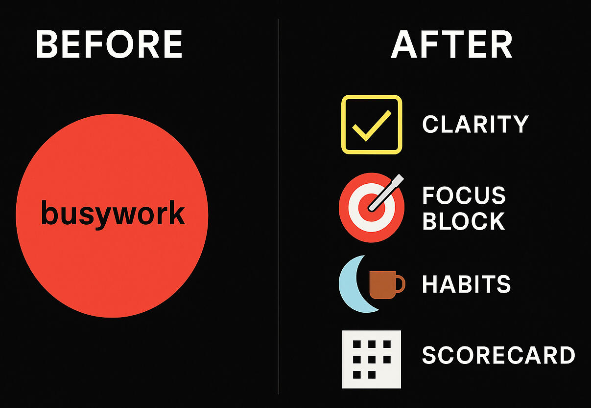 – Your daily Focus Block (60–90 min; can start at 30–45) replaces scattered work with one high-impact session.